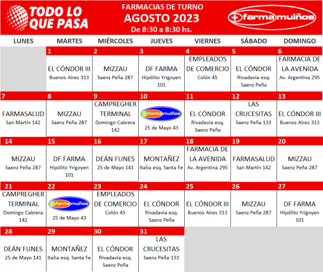Inicio FARMACIAS DE TURNO FARMACIAS DE TURNO AGOSTO 2023. INFO ÚTILFARMACIAS DE TURNOLO QUE TENÉS QUE SABERTODO LO QUE PASALOCALESNOVEDADESSOCIEDAD FARMACIAS DE TURNO AGOSTO 2023. Por todoloquepasa - 1 de agosto de 2023 FacebookTwitterWhatsAppTelegramEmailPrint