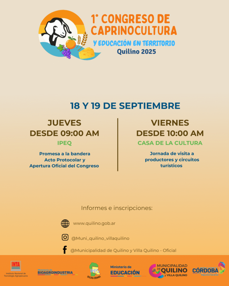 Inscripcion e informacion: https://www.eventbrite.com/e/primer-congreso-de-caprinocultura-y-educacion-en-territorio-quilino-2025-tickets-1673988397359?aff=oddtdtcreator