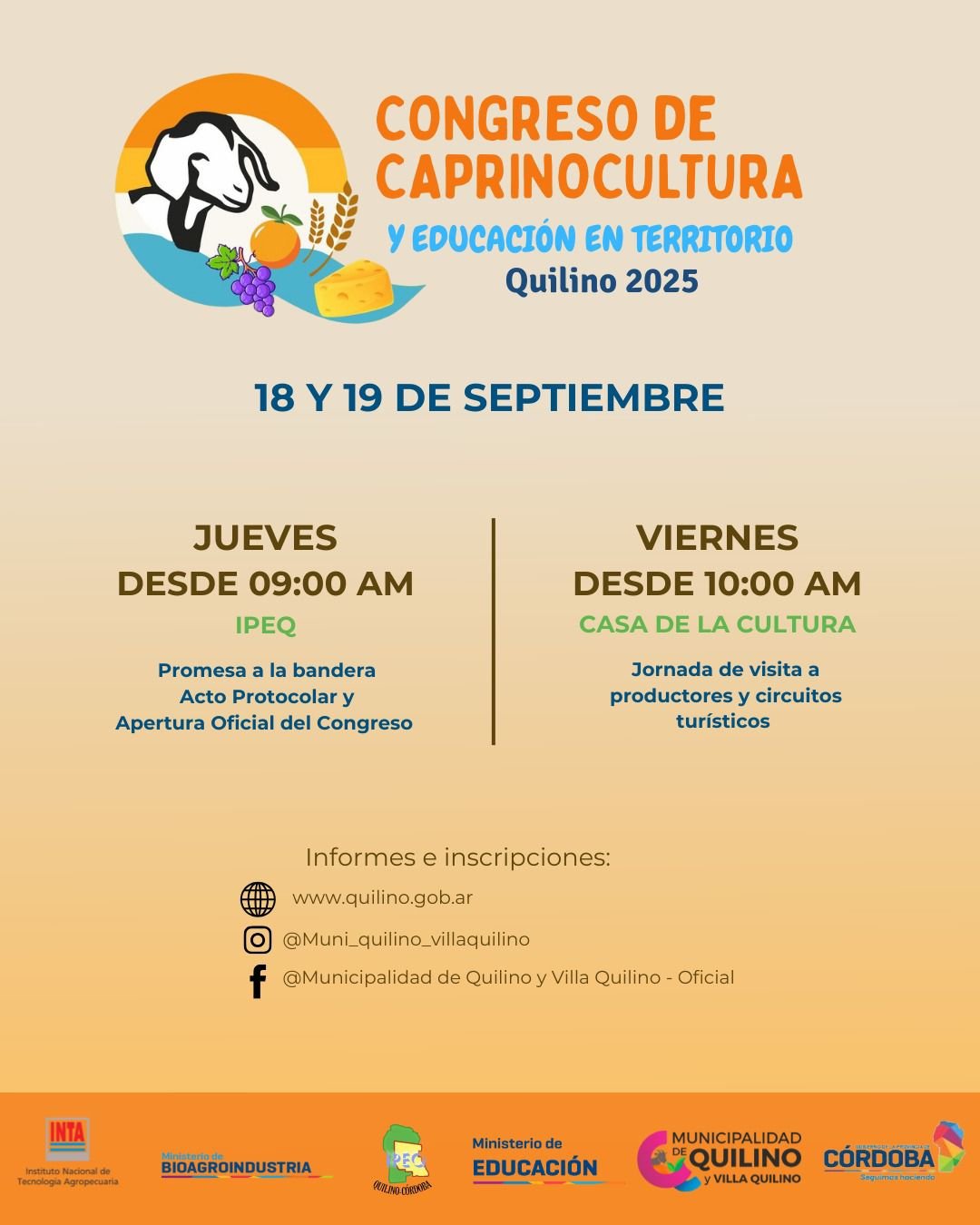 La localidad de Quilino se prepara para recibir el Primer Congreso de Caprinocultura y Educación en Territorio, un evento que busca consolidarse como un espacio de encuentro, formación y desarrollo regional en torno a una de las principales actividades productivas del norte cordobés.