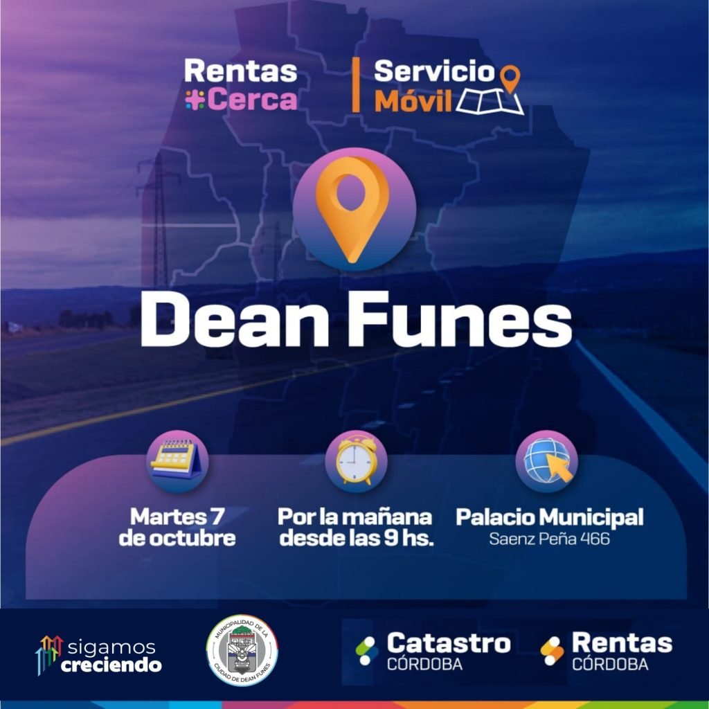 La Municipalidad de Deán Funes informó que este martes 7 de octubre el programa Rentas+Cerca llegará a la ciudad para ofrecer su servicio de atención a los contribuyentes.