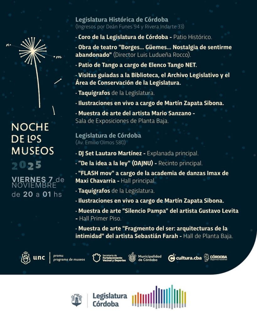 En su edición 2025, la tradicional actividad cultural se realizará el viernes 7 de noviembre, de 20 a 1 de la madrugada, con entrada gratuita. Esta vez, tanto el nuevo edificio de avenida Olmos 580 como el Palacio Histórico abrirán sus puertas a los visitantes. Habrá una nutrida programación artística en ambas sedes legislativas, además de visitas guiadas.