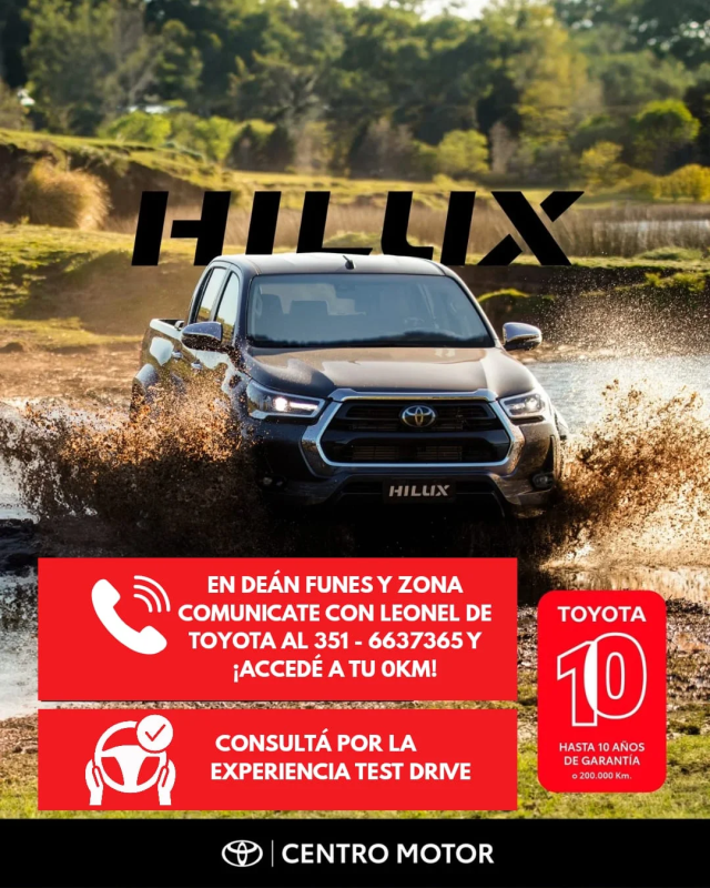 La potencia, resistencia y tecnología de la Toyota Hilux ahora están más cerca que nunca. A través de Centro Motor, los vecinos de Deán Funes y la región pueden acceder a la camioneta más elegida del país, con atención personalizada y beneficios exclusivos.