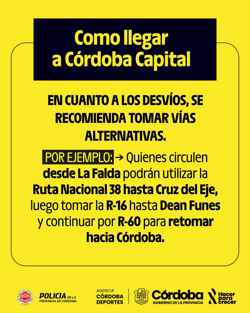 Por su parte, desde la ciudad de Cosquín se sugiere desviar por Santa María de Punilla. Mientras que desde Bialet Massé, si desean circular hacia Córdoba, se recomienda dirigirse hacia Carlos Paz y continuar por colectora hasta Malagueño. Desde allí, tomar la Ruta C-45 hacia Alta Gracia y luego conectar con la Autovía 36, para ingresar a la ciudad por Avenida Vélez Sarsfield.