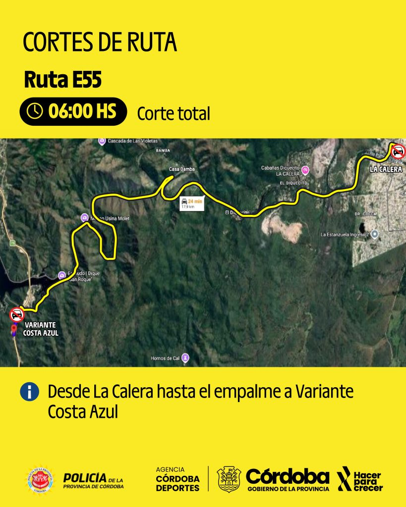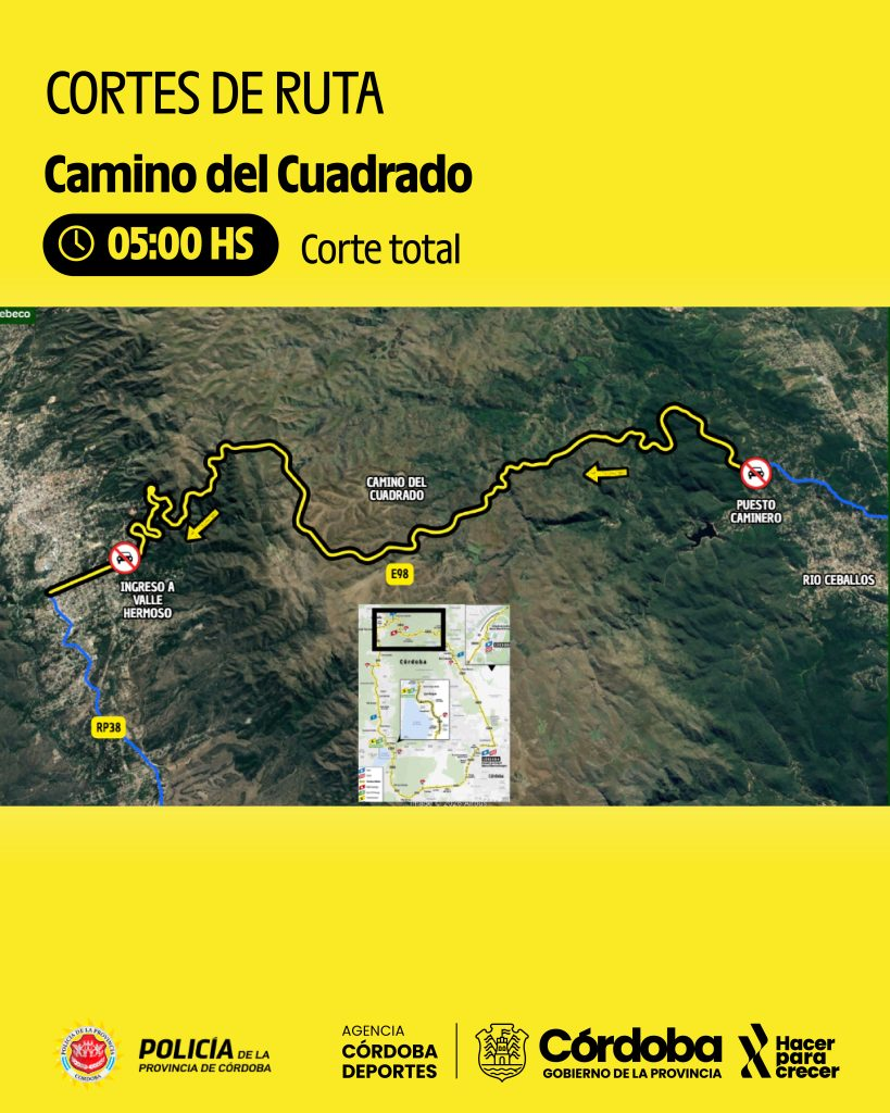 Desde las 7:30 habrá corte total (en ambos sentidos) entre Molinari y la primera rotonda de acceso a Cosquín. En ese mismo horario, se establecerá un corte sobre la mano que va en sentido hacia Córdoba, desde dicha rotonda hasta el empalme con la Autopista Córdoba–Carlos Paz.
