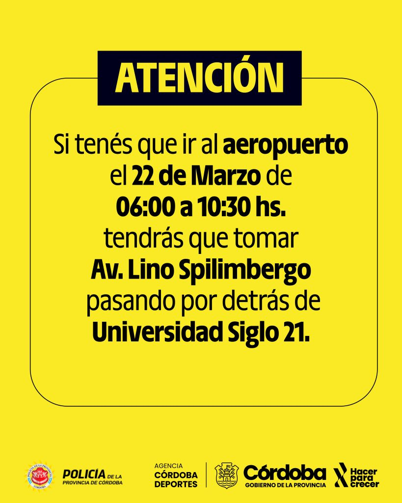 Entre las 6:00 y las 10:30, quienes deban dirigirse hacia el Aeropuerto Internacional Ingeniero Ambrosio Taravella podrán utilizar como vía alternativa la Avenida Lino Spilimbergo, circulando por detrás del campus de la Universidad Siglo 21.