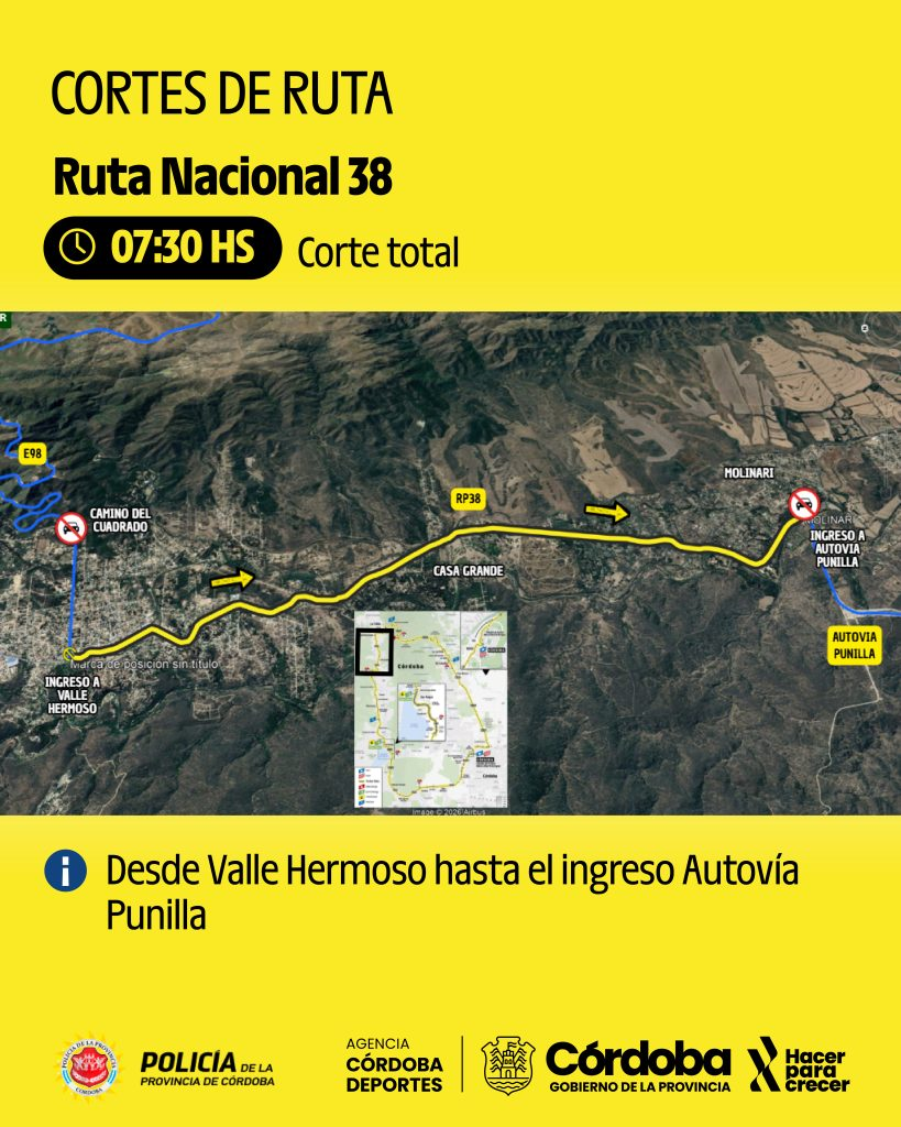 En la ruta nacional 38 también se implementará una restricción total (en ambos sentidos) a partir de las 7:30, entre la localidad de Valle Hermoso y el ingreso a la Autovía Punilla.