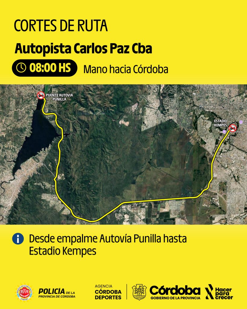 Desde las 8:00 se interrumpirá la circulación sobre la mano que va desde Carlos Paz a Córdoba (hasta la zona del Estadio Kempes).