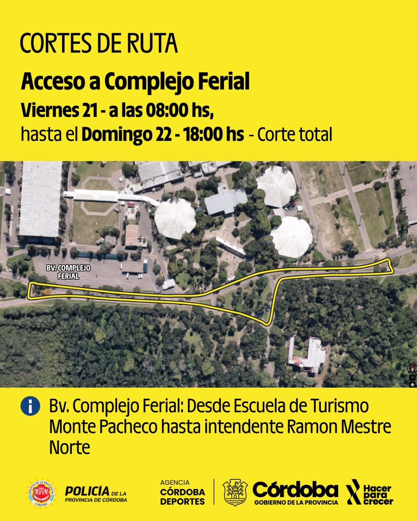 Se verá restringido el acceso al área del evento en el sector del Complejo Ferial, donde se implementará la restricción desde las 8:00 del sábado 21 hasta las 18:00 del domingo 22, sobre el boulevard comprendido entre la rotonda frente a la Escuela de Turismo Montes Pacheco, hasta la avenida Intendente Ramón Mestre Norte (próxima al Country Altos del Chateau).